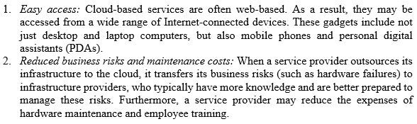 There are almost no out-of-pocket expenses: Pay-as-you-go is the cornerstone of virtualization. A phone company does not want to build equipment to begin reaping the benefits of clouds technology. It only rents & charges for cloud services depending by its own usage. Decreased operating costs: Instruments may well be swiftly allotted and de-allocated in a virtual system. As a consequence, a free company is no immediately required to offer resources in response to maximum demands. This saves a lot of money since resources may be freed to reduce operational expenses when demand is low. High scalability: Infrastructure providers combine a huge number of data center resources and make them readily available. In order to meet fast increases in service demand, a service provider may simply extend its service to enormous sizes (e.g., flash-crowd effect)[1][2][3].