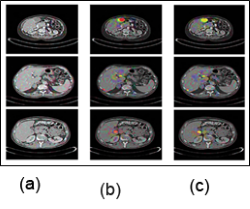 Figure 7: a) Test picture (b) Segmentation output using the suggested HFCNN (c) Malignancy diagnosis on a hepatic image.[1]
